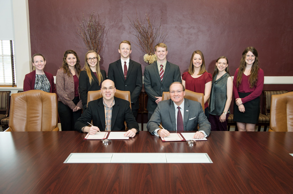 Starkville Mayor Parker Wiseman and Mississippi State President Mark E. Keenum (seated left and right) marked National Nutrition Month with the signing of a proclamation announcing the city and campus observance of the annual March event. The local observance is being coordinated by MSUâs Student Dietetic Association, an organization of the Department of Food Science, Nutrition and Health Promotion in the College of Agriculture and Life Sciences. Pictured at the signing, left to right, are MSU food science, nutrition and health promotion students Kayleigh A. Hynes, a senior from Cornelius, North Carolina, SDA liaison; Sophie M. Goyins, a senior from Pensacola, Florida, SDA scholarship chair; Alesa Taylor, a senior from Guntown, SDA vice president; Austin J. Vaughn, a junior from Hernando; Turner Sanderson, a senior from Smithville, SDA professional development representative; Molly C. Stevenson, a junior from Marietta, Georgia, SDA secretary; Haley P. Wheeler, a senior from Huntsville, Alabama, SDA president; and Cecily B. Young, a graduate student from Greenville, South Carolina.
