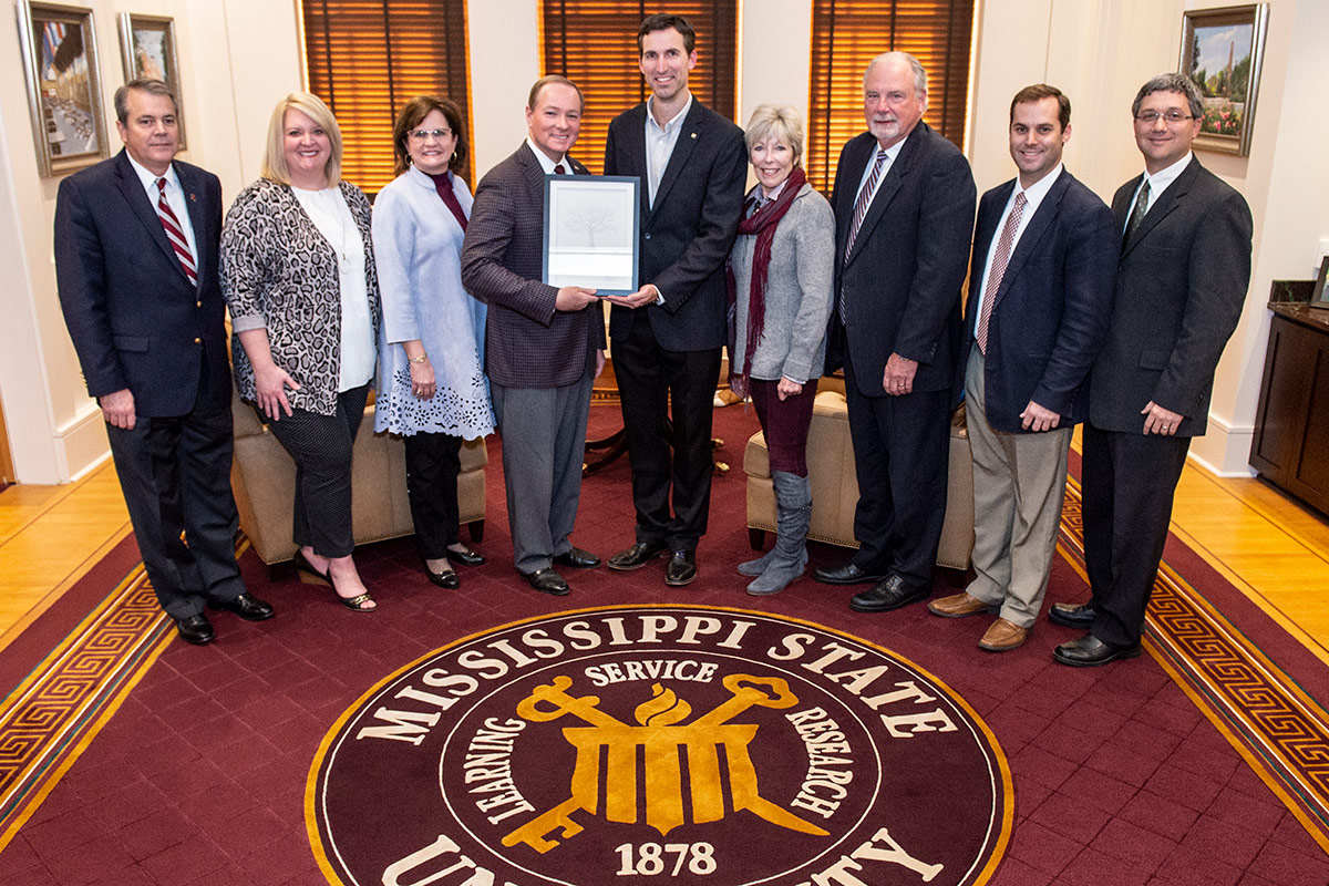 The Tennessee Valley Authority recognized Mississippi State in November with a 2018 Carbon Reduction Award for improving energy efficiency and reducing carbon emissions. Served by Starkville Utilities, MSU has implemented efficiency measures saving over $55 million over the past decade in utility costs. Pictured, from left, are MSU Assistant Vice President for Campus Services George Davis, TVA Government Relations Manager Amy Tate, MSU Vice President for Campus Services Amy Tuck, MSU President Mark E. Keenum, TVA Customer Service Manager Josh Wooten, Starkville Mayor Lynn Spruill, Starkville Utilities General Manager Terry Kemp, Starkville Utilities Assistant Manager Jacob Forrester and MSU Associate Director of Engineering Services J.D. Hardy.