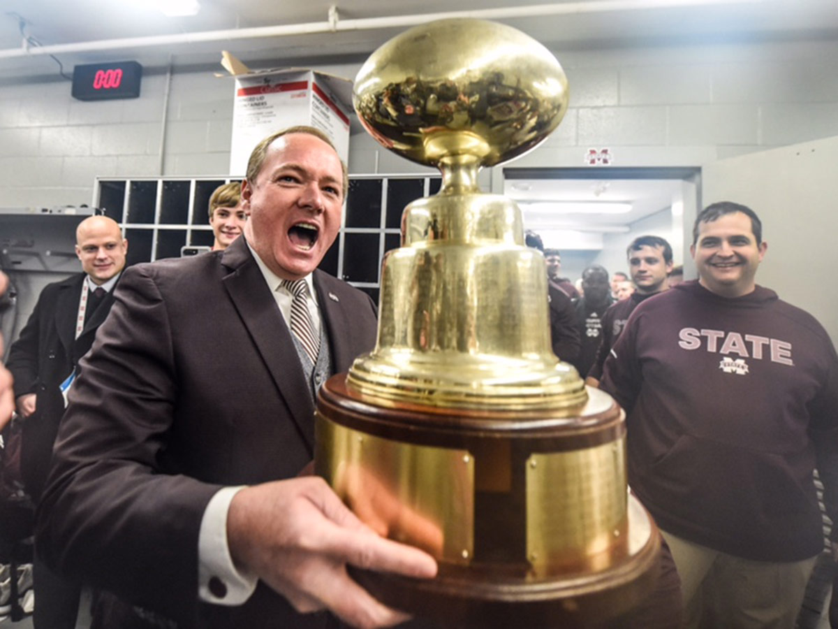 In the postgame locker room at Vaught-Hemingway Stadium in Oxford, MSU President Mark Keenum thanked the MSU Bulldogs and Coach Joe Moorhead for winning the 2018 Egg Bowl and bringing the trophy home.