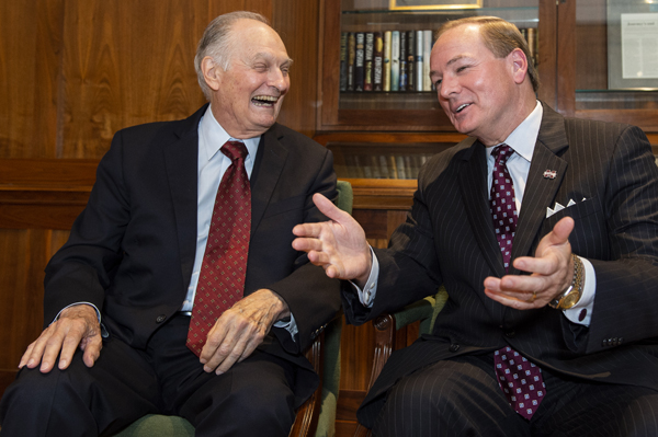 MSU President Mark E. Keenum shares a laugh with award-winning actor and author Alan Alda during a luncheon in the Grisham Room of Mitchell Memorial Library. Alda’s visit included a public lecture in Lee Hall and faculty from the Alan Alda Center for Communicating Science at Stony Brook University led a workshop for university researchers on how to effectively communicate about science.