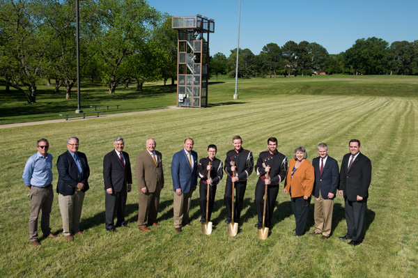 Celebrating a groundbreaking ceremony Monday [April 30] for a new synthetic turf practice field for the Famous Maroon Band were Principal and Owner of Allred Stolarski Architects Hoppy Allred; MSU Director for Planning, Design and Construction Tim Muzzi; MSU Professor and Head of the Department of Music Barry Kopetz; College of Education Dean Richard Blackbourn; MSU President Mark E. Keenum; Drum Majors Jacob T. Baker of Falkville, Alabama, Jacob S. Lanier of Marietta, Georgia, and Reece G. Paulk of Ruth; Director of Bands Elva Kaye Lance; Associate Director of Bands Cliff Taylor; and Associate Director of Bands Craig Aarhus.