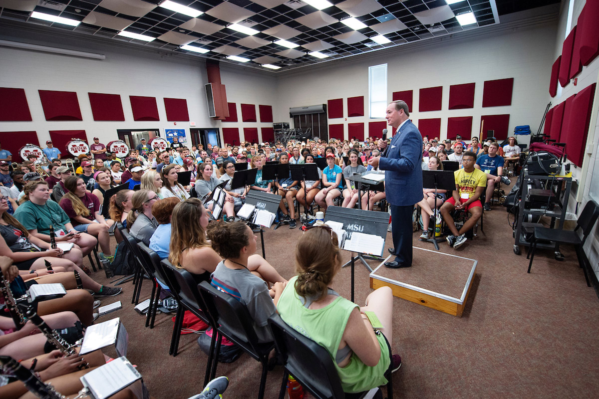 Famous Maroon Band MSU President Mark E. Keenum paid a surprise visit to one of the Famous Maroon Band’s rehearsals in August to thank members for their hard work and preparation for the 2018 football season.