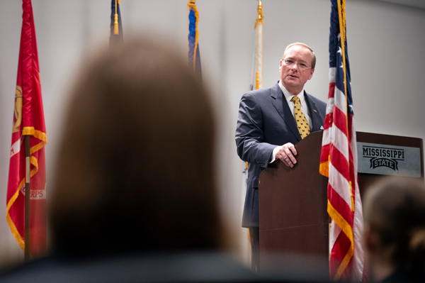 MSU President Mark E. Keenum speaks at the university’s annual Veterans Day program. The annual event recognizes all in the MSU community who have served or are serving in the United States Armed Forces. Keenum discussed the university’s military history and ongoing support for veterans, active duty service members and their dependents.