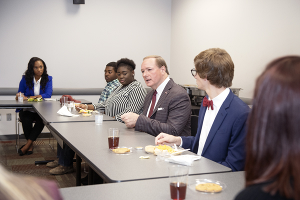 MSU President Mark E. Keenum, center, visits the “LEAD Maroon” First Year Experience class taught by Student Association President Mayah J. Emerson, far left, a senior educational psychology major from Meridian. The LEAD Maroon class is among SA initiatives that recently received honors at the Southeastern Conference Exchange. This year, the SA was recognized for its advocacy and leadership in developing and implementing innovative, sustainable programs and services in support of student needs within a diverse campus community.