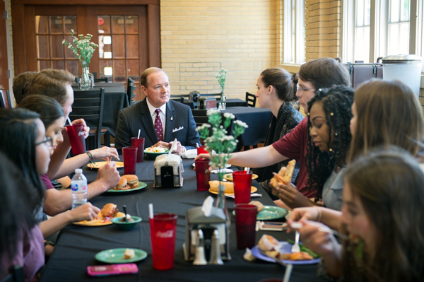 Mississippi State President Mark E. Keenum met in April for lunch with members of the university’s Freshman Edge organization, operated under the auspices of the MSU Student Association.