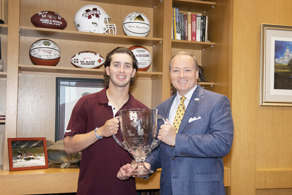 Mississippi State shortstop Luke Alexander presents MSU President Mark E. Keenum with the 2018 Governorâs Cup trophy. For the third consecutive year, the Diamond Dawgs beat the University of Mississippi in the annual game played in Pearlâs Trustmark Park. Alexander, a junior from Belmont, had the game-winning hit in MSUâs 7-6 victory in April.