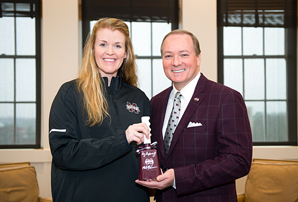 Mississippi State University President Mark E. Keenum presents a cowbell to Julie Darty, MSUâs new womenâs head volleyball coach. Darty was named MSUâs 12th volleyball coach in December and met with Keenum in Lee Hall on Thursday [Jan. 11]. Before coming to MSU, she served as the head volleyball coach at Jacksonville State University. The Oviedo, Florida, native and Mercer University alumna has eight years of collegiate coaching experience.