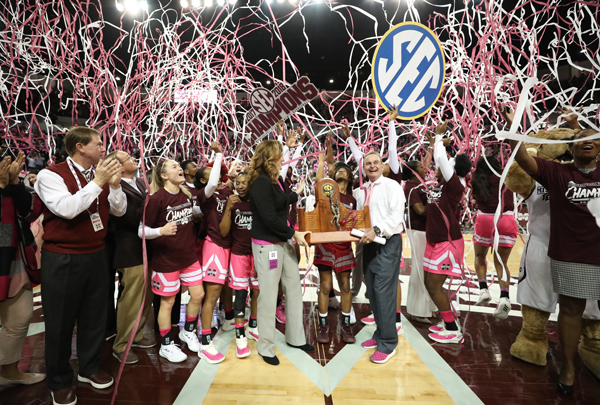 The Mississippi State women's basketball team celebrates clinching the 2017-18 SEC Championship after defeating Texas A&M on Feb. 18 at Humphrey Coliseum. With the historic win, the Bulldogs improved their record to 28-0 and secured the first regular season SEC Championship in program history.