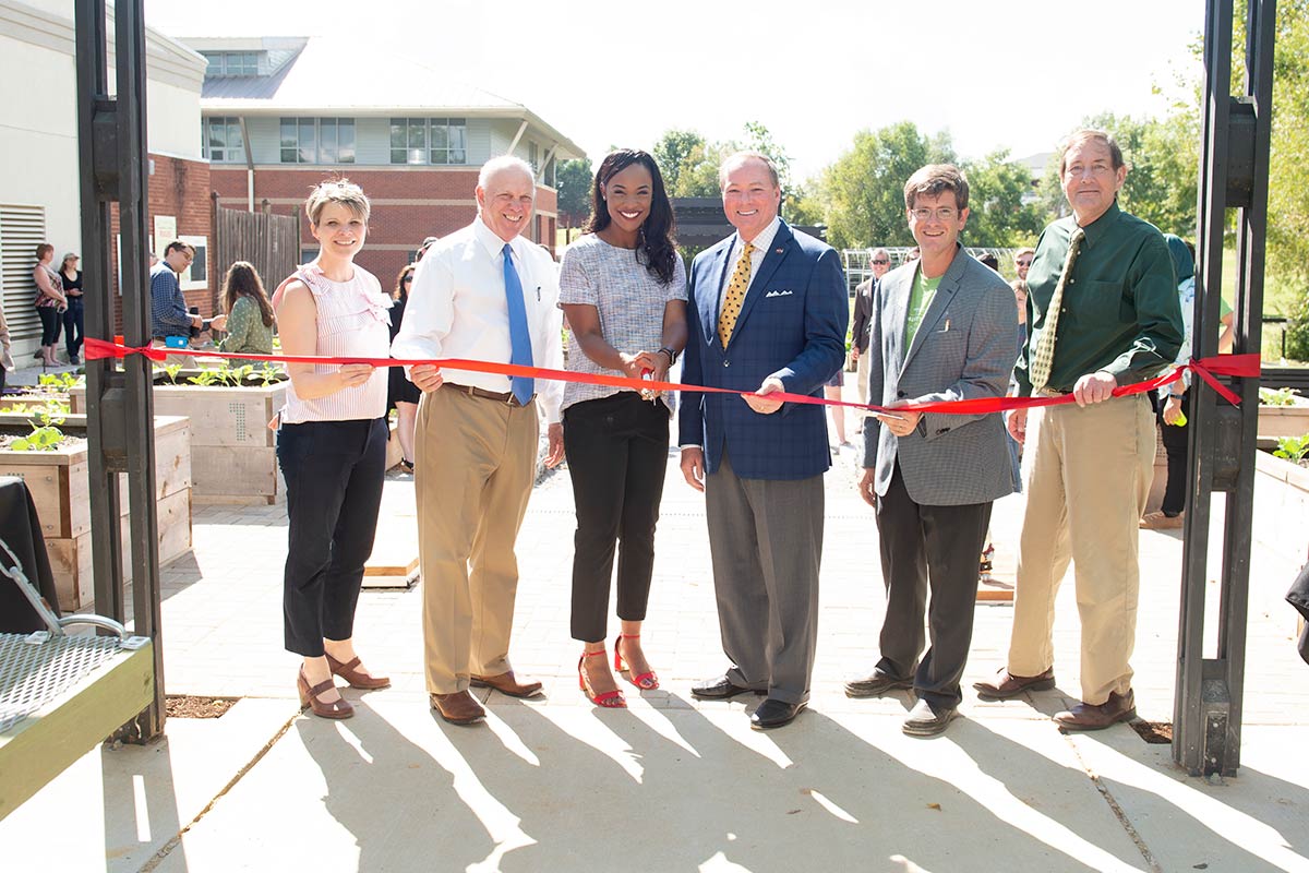 Celebrating a ribbon cutting ceremony Oct. 15 at the MSU Community Garden are (l-r) Dean Angi Elsea Bourgeois of MSU’s College of Architecture, Art and Design; Dean George Hopper of MSU’s College of Agriculture and Life Sciences; Student Association President Mayah Emerson; MSU President Mark E. Keenum; Associate Professor of Landscape Architecture Cory Gallo; and Vice President for Agriculture, Forestry and Veterinary Medicine Gregory Bohach.