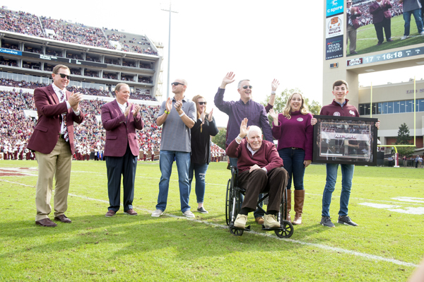 MSU Athletic Director John Cohen, far left, and MSU President Mark E. Keenum, second from left, congratulate MSU football legend Art Davis on his induction into the Bulldogs’ “Ring of Honor” during halftime of the Nov. 17 MSU vs. Arkansas game at Davis Wade Stadium. Joined by his family, Davis was an elite two-way player for the Bulldogs from 1952-55. The Clarksdale native’s NFL career was cut short due to a knee injury, but his efforts were honored with 1971 MSU Sports Hall of Fame and 1981 Mississippi Sports Hall of Fame inductions.