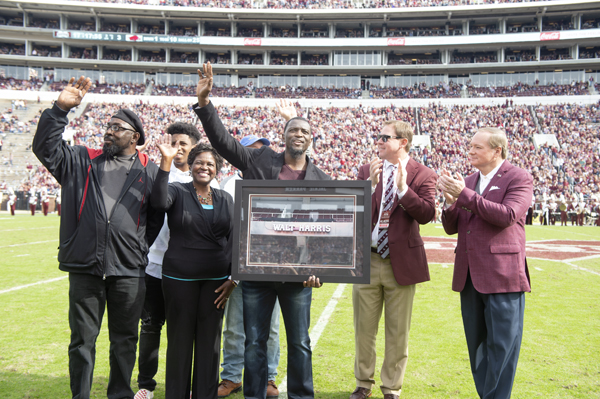 MSU President Mark E. Keenum and Athletic Director John Cohen congratulate Mississippi State football legend Walt Harris on being inducted into the MSU “Ring of Honor” at Davis Wade Stadium during the university’s home football game against Arkansas. Joined by his family for the recognition, Harris is one of the most prolific cornerbacks in SEC history, having started 24 straight games for MSU from 1992-95 and setting the school record for career interceptions with 16. He earned All-SEC honors three times at MSU before being drafted in the first round of the 1996 NFL Draft. He spent 13 seasons playing in the NFL for the Chicago Bears, Indianapolis Colts, Washington Redskins and San Francisco 49ers.