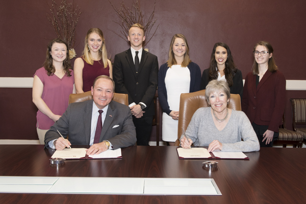 MSU President Mark E. Keenum and Starkville Mayor Lynn Spruill sign a proclamation announcing the city and campus observance of March as National Nutrition Month. Joining Keenum and Spruill for the signing are MSU Student Dietetic Association members, standing from left, Amanda Yanvary, Allie Cowles, Austin Vaughn, Molly Stevenson, Julie Mabry and Emily Knight.