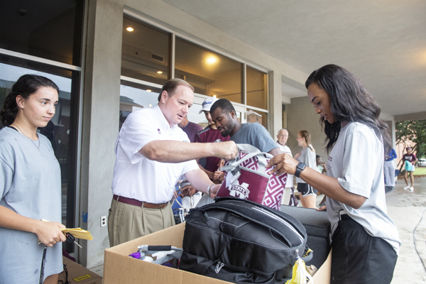 MSU President Mark E. Keenum and Student Association President Mayah Emerson, right, assist students as they move in to Rice Hall during MVNU2MSU. Keenum and Emerson were among the hundreds of volunteers on hand to help and welcome new MSU students as they moved into their residence halls.