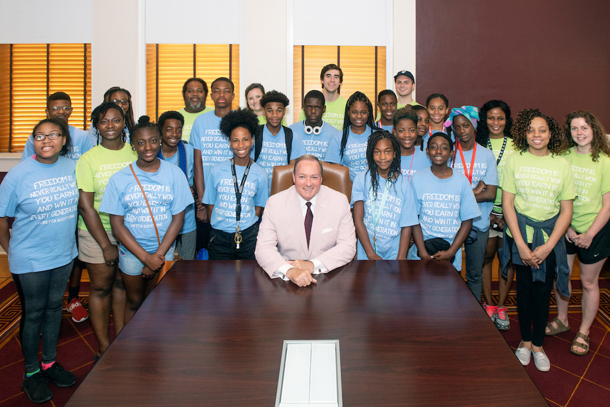 Participants of the Meridian Freedom Project visiting Mississippi State University this week met with MSU President Mark E. Keenum Wednesday [July 25] in historic Lee Hall. Keenum welcomed the youth to campus and discussed the importance of higher education. The organization emphasizes core values of leadership and character development, academic support, arts enrichment, educational travel and health training. The Meridian Freedom Project’s annual “Freedom Summer” program includes a week on a college campus in which participants live in residence halls, meet professors and college students, learn about the application and enrollment process, and enjoy a preview of college life. The group, led by Director Anna Stephenson Watson, is a sponsored program of Meridian Community College, operated in partnership with The Montgomery Institute. Other instrumental support has come from The Phil Hardin Foundation, among others.