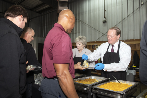 Starkville Mayor Lynn Spruill and MSU President Mark E. Keenum serve a Thanksgiving lunch to area first responders on Monday [Nov. 19]. The annual event is a way to thank first responders for all they do for Starkville, MSU and Oktibbeha County.