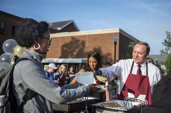 President serving up pancakes MSU President Mark E. Keenum serves pancakes to students outside of Colvard Student Union in October as part of Pancakes on the Plaza, an annual Homecoming Week event.