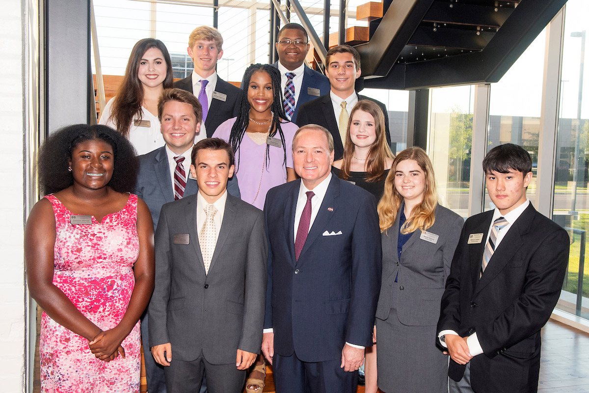 MSU President Mark E. Keenum (front row, center) visited with the university’s newest Presidential Scholars during a Sept. 14 dinner at The Mill at MSU in Starkville. Pictured are (front row, l-r) Aryonna Johnson, Reese Dunne, (Keenum), Maeve Rigney, Marcus Jordan; (middle row, l-r) Tyler Dickerson, Kayla Powe, Anne Elizabeth Harrington; (back row, l-r) Flora Dedeaux, Graham Roberson, Christopher Robinson and Ryan Jarratt.