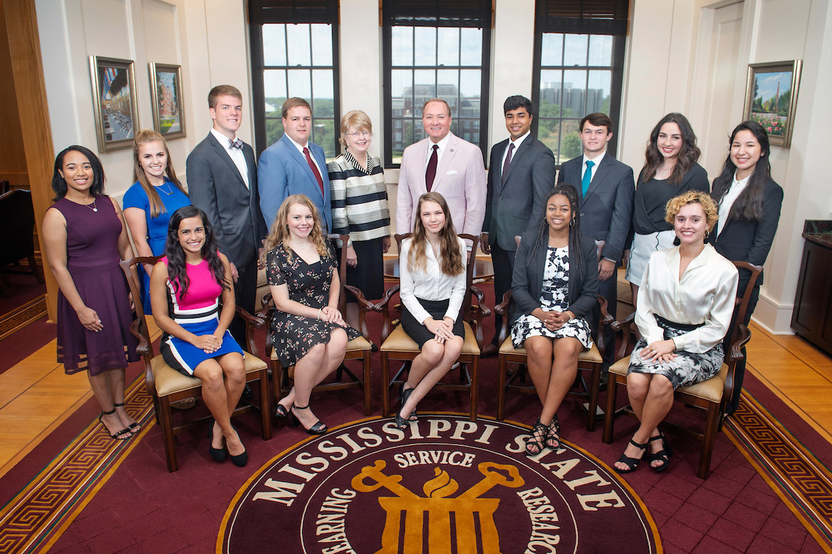 Mississippi State’s 2018-19 Provost Scholars were welcomed to the Starkville campus for the fall semester by the university’s Provost and Executive Vice President Judy Bonner, standing center left, and President Mark E. Keenum, standing center right. These outstanding students receive academic and study abroad scholarships, grants for research or creative discovery, and optional travel grants to attend a conference.