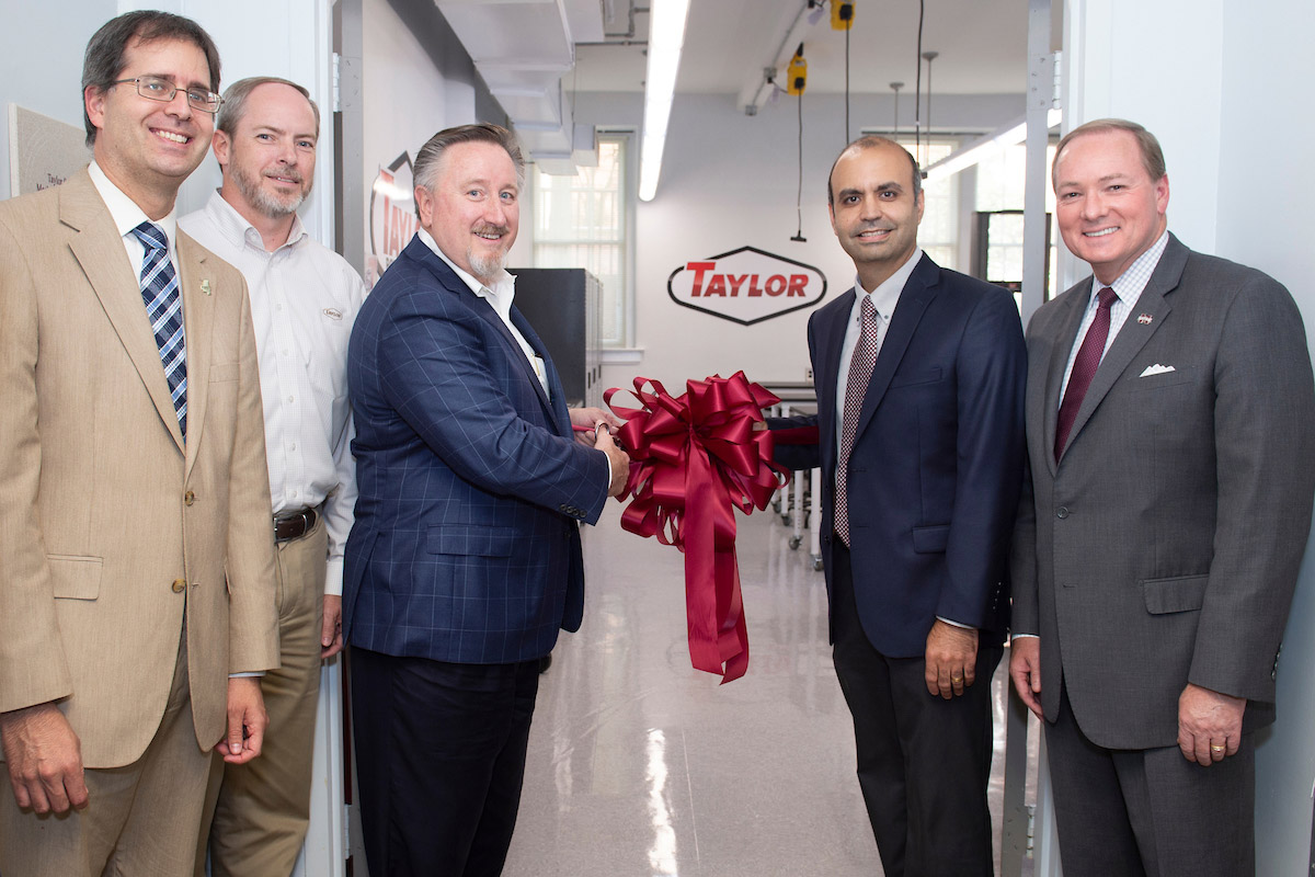 Celebrating a ribbon-cutting ceremony for the new Taylor Solid Mechanics Laboratory at MSU were, from left, Jason Keith, Bagley College of Engineering dean; Matt Hillyer, director of engineering for the Taylor Group who also is an MSU mechanical engineering department advisory board member; Lex Taylor, chairman and CEO of the Taylor Group, Inc.; Pedro Mago, professor and head of mechanical engineering; and MSU President Mark E. Keenum.