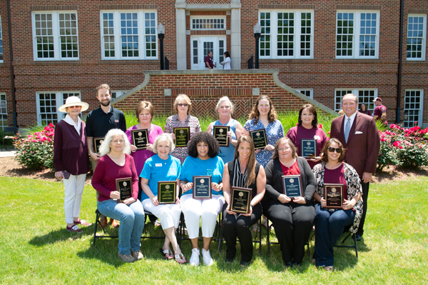 Tommie Zacharias, widow of former MSU President Donald Zacharias (back, far left), and MSU President Mark E. Keenum (back, far right) congratulate the university’s newest Zacharias Distinguished Staff Award winners.