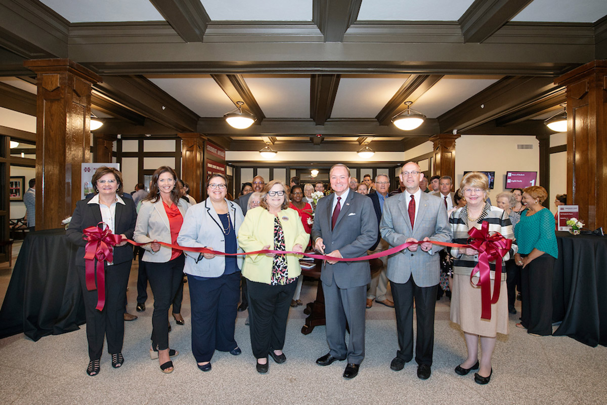 MSU officials celebrating the completed renovation of the university’s historic YMCA Building with a Tuesday [July 31] ribbon cutting were, from left, Vice President for Campus Services Amy Tuck; General Counsel Joan Lucas; Vice President for Student Affairs Regina Hyatt; Belinda Stewart of Belinda Stewart Architects; MSU President Mark E. Keenum; MSU Vice President for Finance and CFO Don Zant; and Provost and Executive Vice President Judy Bonner.