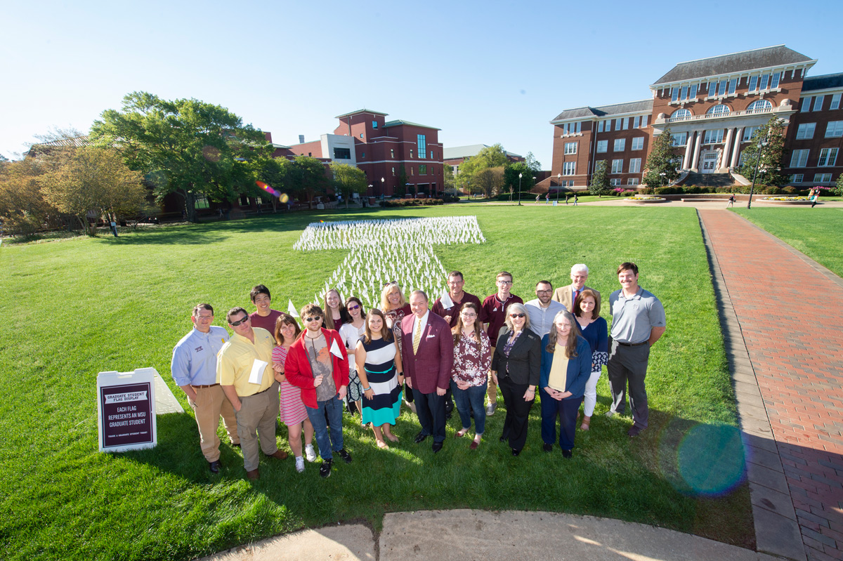 MSU President Mark E. Keenum (front row, center) and Graduate School students, staff and administrators, stand near a white flag display on the university’s historic Drill Field. Part of Graduate Student Appreciation Week, the flag display represents the 3,000 MSU graduate students enrolled for the current academic year.