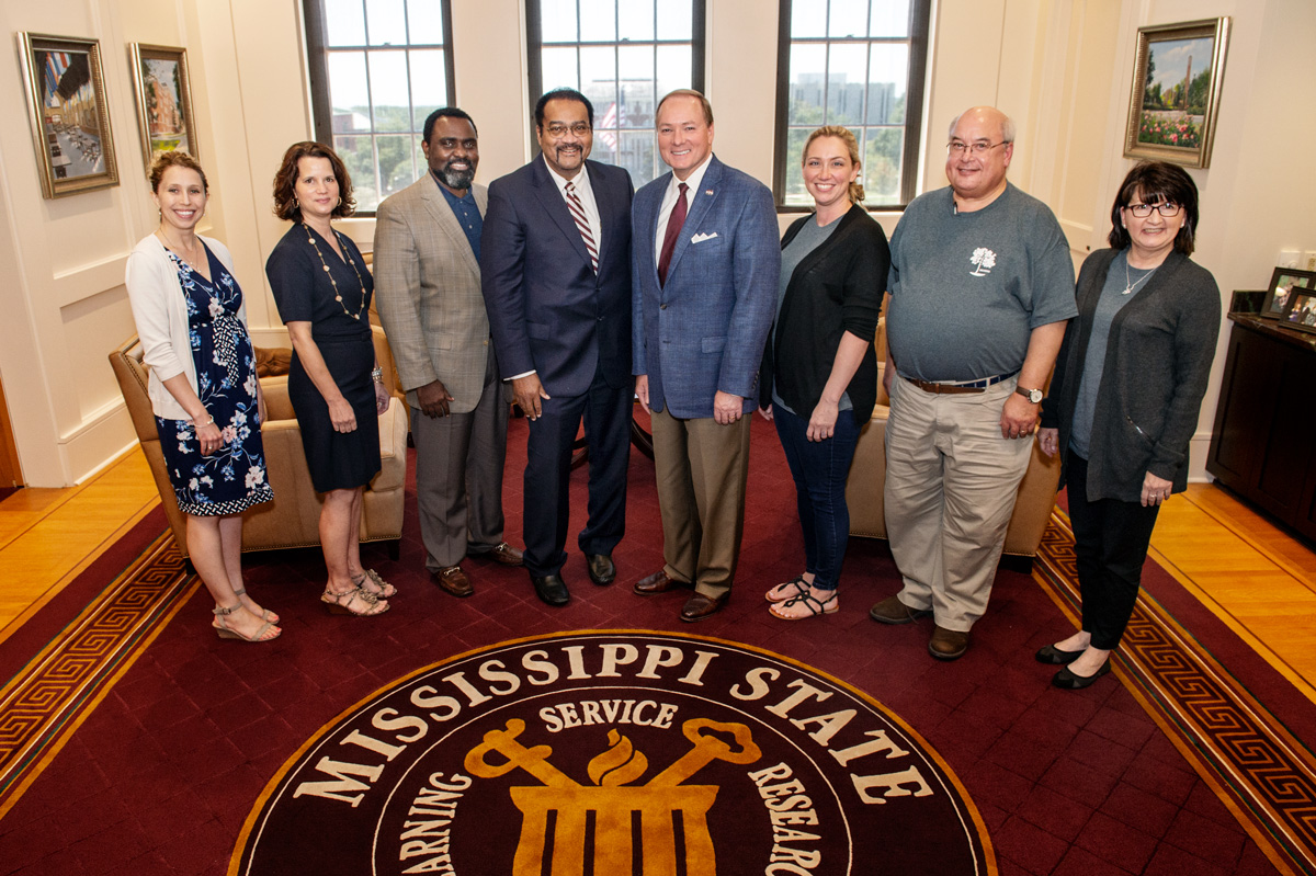 Visitors attending the Mississippi Parent Training and Information Center’s 2019 “Creating Your Own Path” Autism Transition Conference at The Mill at MSU toured the university’s T.K. Martin Center for Technology and Disability and the Autism and Developmental Disabilities Clinic. Among those attending (l-r) and visiting MSU President Mark E. Keenum are Dr. Kasee Stratton-Gadke, director of the T.K. Martin Center; Julie Capella, assistant dean and director of MSU Student Support Services; Dr. Durand Payton, educational consultant; Dr. Alfred McNair, IHL Board of Trustees member and board certified gastroenterologist; Dr. Keenum; and Mississippi Center for Autism and Related Developmental Disabilities staff members Katelyn Martin, board certified behavior analyst; Wayne Williams, executive director of clinical operation; and Donna Joachim, director of education enrichment.