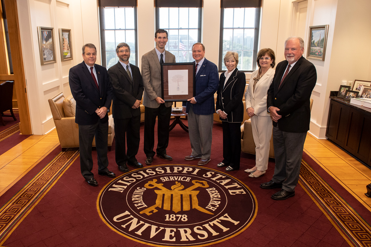The Tennessee Valley Authority recognized Mississippi State in October with a 2019 Carbon Reduction Award for improving energy efficiency and reducing carbon emissions. The award recognizes MSU for going “above and beyond” in efforts to have low carbon emissions in calendar year 2018. Served by Starkville Utilities, MSU has implemented efficiency measures saving over $60 million since 2006 in utility costs. Pictured, from left, are MSU Assistant Vice President for Campus Services George Davis, MSU Associate Director of Engineering Services J.D. Hardy, TVA Customer Service Manager Josh Wooten, MSU President Mark E. Keenum, Starkville Mayor Lynn Spruill, MSU Vice President for Campus Services Amy Tuck and Starkville Utilities General Manager Terry Kemp.