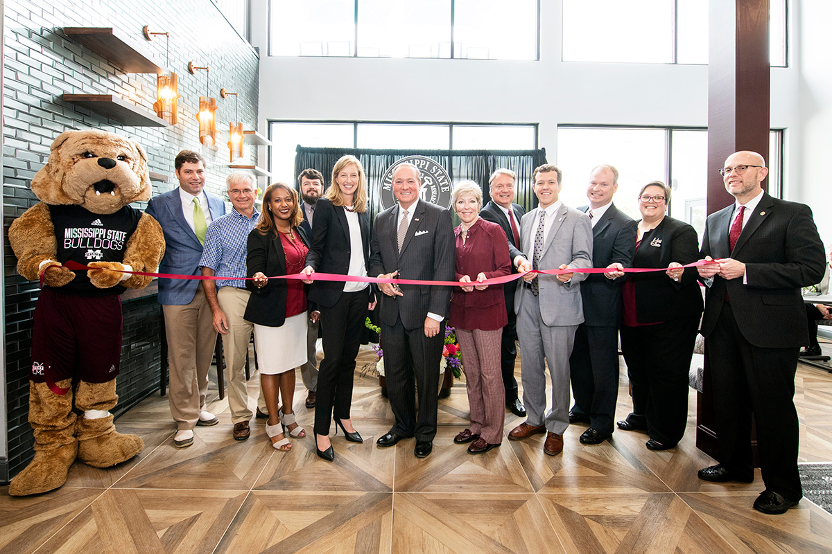 Mississippi State and Greystar officials cut a ribbon to mark the completion of the College View student housing development, which includes over 650 residential beds and 46,000 square feet of residential space. The project is a public-private partnership between MSU and Greystar Real Estate Partners. Pictured, from left, are MSU’s Bully mascot, Hanbury Principal and Planner Reid Sabin, Montgomery Martin Contractors Vice President Jeff Emerson, MSU Director of Housing and Residence Life Dei Allard, McCarty Architects Architectural Team Leader Justin Harrington, Greystar Senior Managing Director of University Partnerships Julie Skolnicki, MSU President Mark E. Keenum, Starkville Mayor Lynn Spruill, Greystar Vice President for Real Estate Development Mark Grambergs, MSU Student Association President Jake Manning, MSU Fiscal Operations Analyst Les Potts, MSU Vice President for Student Affairs Regina Hyatt and MSU Vice President for Finance and Chief Financial Officer Don Zant.