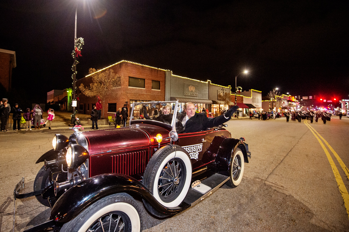 MSU President Mark E. Keenum and Starkville Mayor Lynn Spruill ride down Main Street as grand marshals in Starkville’s annual Christmas parade. The theme of the 2019 parade was “A Town & Gown Christmas” in honor of the many partnerships between MSU and the city.