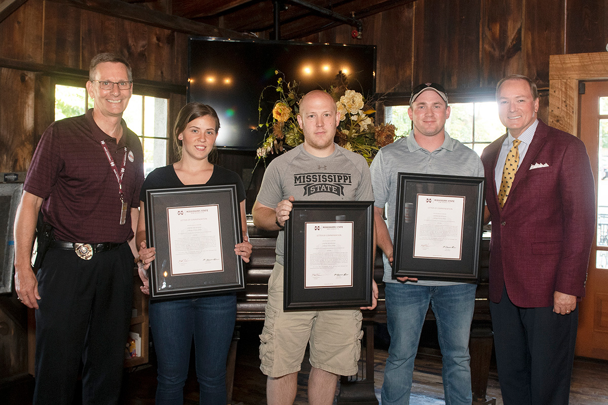Mississippi State President Mark E. Keenum and Chief of Police Vance Rice recognized three members of the university police department Tuesday [Aug. 6] for taking life-saving action during a May incident response.Pictured, from left, are Rice, Officer Mikayla Sanford, Corporal Patrick Jenkins, Corporal Willie Bailey and Keenum. On May 3, the three officers were dispatched regarding a vehicle passenger having a medical issue. Upon arrival, the officers moved the victim to a safe location and determined he had no pulse and was not breathing. After retrieving an automated external defibrillator, the officers delivered a shock and administered CPR until the victim regained consciousness. They then assisted EMS personnel in loading the victim into an ambulance.