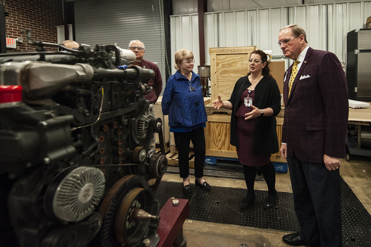 Mississippi State has been reliable in the growth of Mississippi’s auto manufacturing industry. These alliances boost manufacturing in the state and foster significant jobs creation. This week, MSU’s President Mark E. Keenum, right, learned more from Mechanical Engineering Assistant Professor Andrea Strzelec, second from right, about the latest research being conducted in the university’s Center for Advanced Vehicular Systems. Also a part of the tour were Clay Walden, left, CAVS executive director, and Judy Bonner, MSU provost.