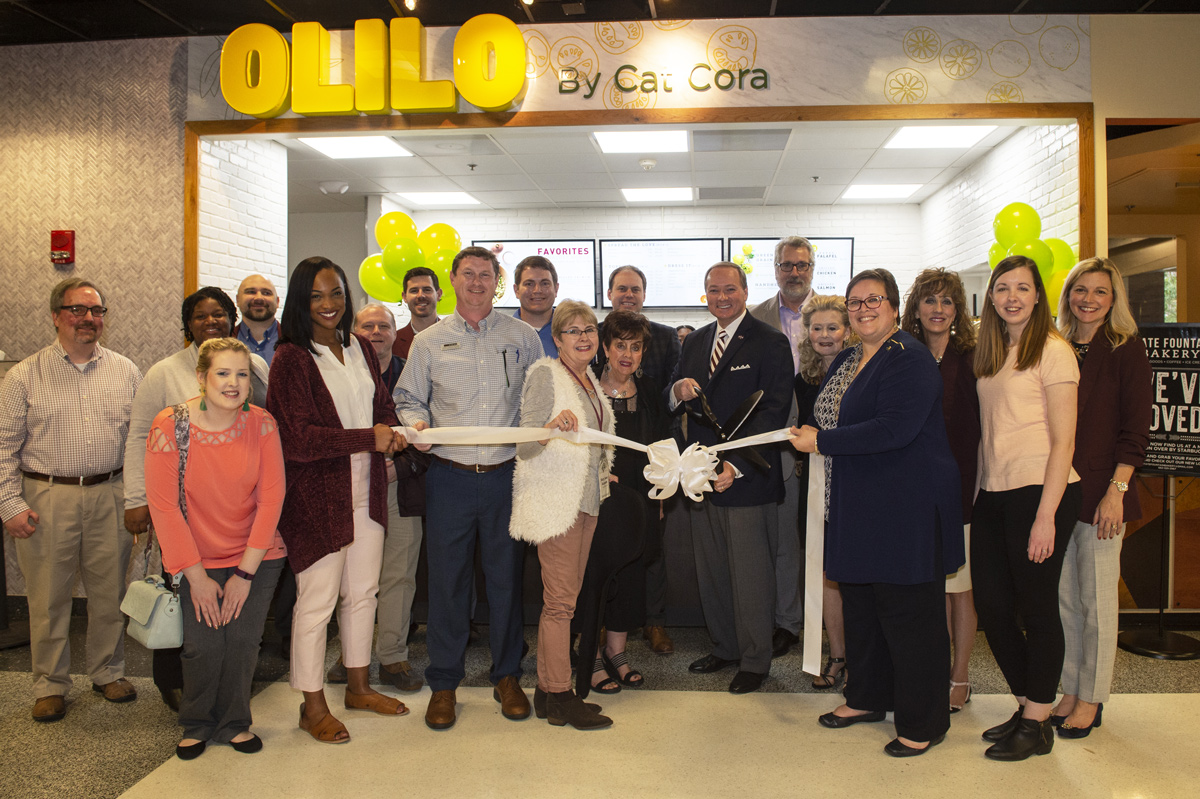 Mississippi State University and Aramark leaders, including President Mark E. Keenum (holding scissors), Student Association President Mayah Emerson and Vice President for Student Affairs Regina Hyatt, participated in a Monday [Feb. 4] ribbon cutting at Colvard Student Union to celebrate the opening of OLILO, a Mediterranean fast-casual restaurant offering exclusive, signature recipes developed by Jackson native and global restauranteur Cat Cora. Also attended by Starkville area leaders including Greater Starkville Development Partnership Ambassadors, the ceremony was sponsored by MSU Dining Services.