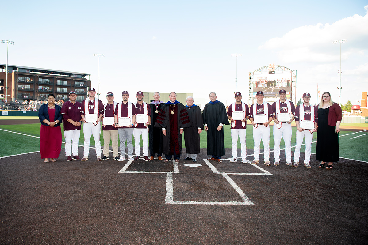 MSU President Mark E. Keenum, eighth from left, and Mississippi Institutions of Higher Learning board members were among those who congratulated and presented diplomas to graduating Diamond Dawg seniors before MSU’s Thursday [May 16] baseball game versus South Carolina at the new Dudy Noble Field.