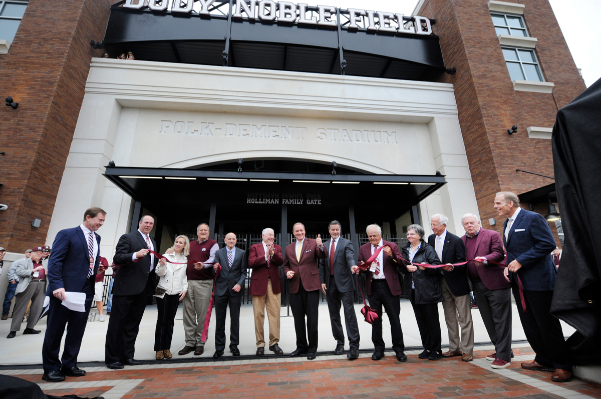 Celebrating a ribbon cutting for the $68 million new Dudy Noble Field are, from left, MSU Athletic Director John Cohen, Bulldog baseball legend Will Clark, project benefactors Dana and Charlie Stephenson, Voice of the Diamond Dawgs Jim Ellis, benefactor Richard Adkerson, MSU President Mark E. Keenum, Bulldog baseball legend Rafael Palmeiro, former MSU baseball coach Ron Polk, benefactors Babs and Mickey Holliman, and Mississippi Institutions of Higher Learning Board of Trustee members Hal Parker and Bruce Martin.
