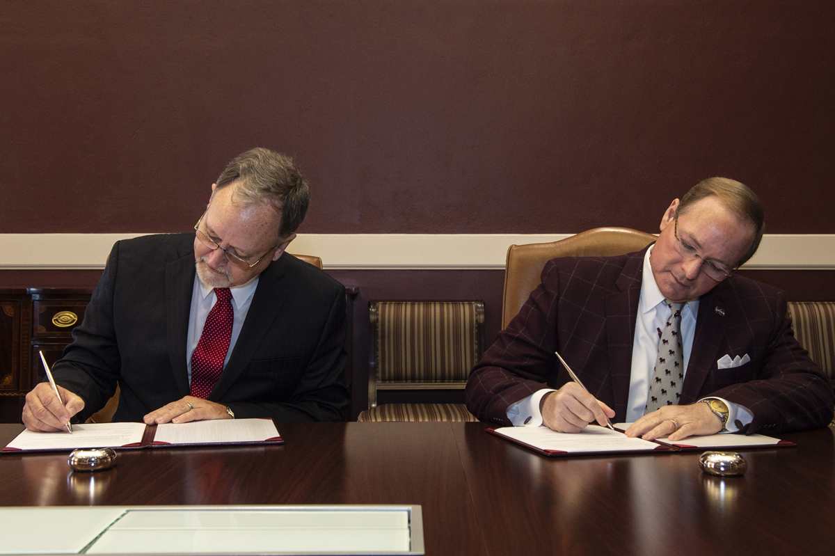 Mississippi State President Mark E. Keenum, right, and Mississippi Delta Community College President Larry Nabors signed an articulation agreement on January 28, easing the transition for MDCC Honors College students who wish to enroll in the MSU Judy and Bobby Shackouls Honors College. MDCC students in good standing, carrying a cumulative GPA of 3.4 or better and submitting a letter of support from their director, will be granted direct admission to MSU’s Shackouls Honors College contingent on admission to MSU.