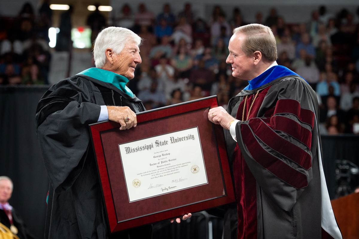 George H. Bishop, left, receives an honorary Doctor of Public Service degree from MSU President Mark E. Keenum during Friday [May 3] morning commencement ceremonies at Mississippi State University. The Smith County native is a 1958 MSU petroleum geology graduate who in 1981 founded GeoSouthern Energy, which grew to become one of the largest, privately held producers of oil and gas in the country.