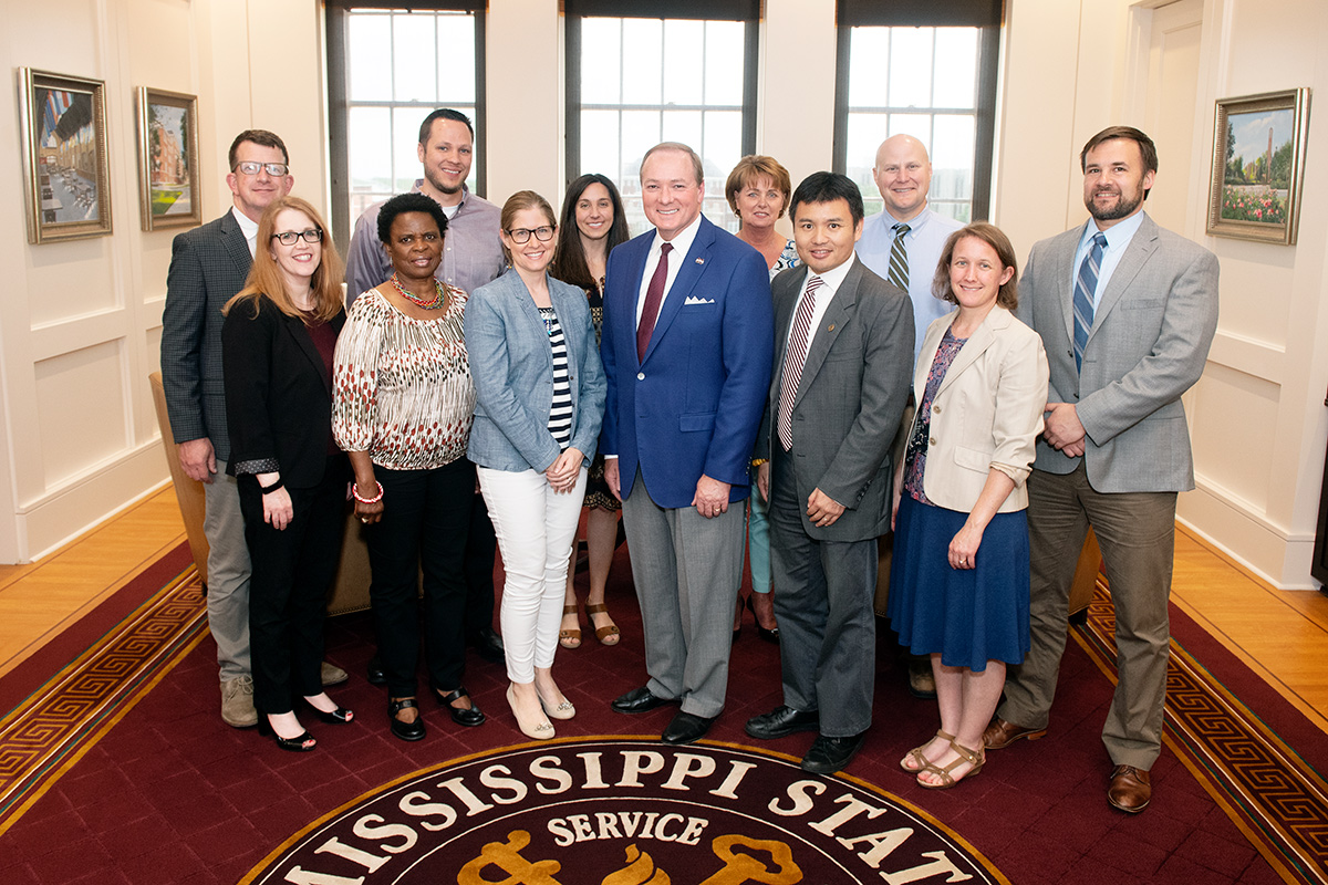 Graduates of Mississippi State’s 2018-2019 William L. Giles Faculty Leadership Program met in late April with MSU President Mark E. Keenum (front row, center), Administrative Assistant to the Vice President for Research and Economic Development Lynn Taylor (back row, third from left) and Assistant Vice President for Research Teresa Gammill (back row, fourth from left). The graduates include (front row, left to right) Kathleen Thomas, professor and head, Department of Finance and Economics; Mabel Okojie, professor, Department of Instructional Systems and Workforce Development; Jamie Larson, associate professor, Department of Animal and Dairy Sciences; Keenum; Yucheng Liu, associate professor, Department of Mechanical Engineering; Julia Osman, associate professor, Department of History; (second row, left to right) Critz Campbell, associate professor, Department of Art; Adam Knight, associate professor, Department of Kinesiology; Taylor; Gammill; Todd Archer, associate professor, Department of Clinical Sciences, College of Veterinary Medicine; and Brian Shoup, associate professor, Department of Political Science and Public Administration. Not pictured is Darrell Sparks, associate professor, Department of Biochemistry, Molecular Biology, Entomology and Plant Pathology.
