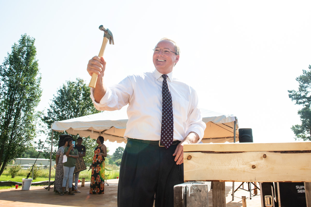MSU President Mark E. Keenum celebrates after driving the ceremonial first nail for the 11th Maroon Edition Home, which is being built by MSU and Starkville Area Habitat for Humanity for Keyana Triplett and her family. The Maroon Edition program was initiated by MSU’s Office of the Provost in 2009 and has since brought students together around a common book and united thousands of volunteers to build new homes for 11 Habitat partner families.