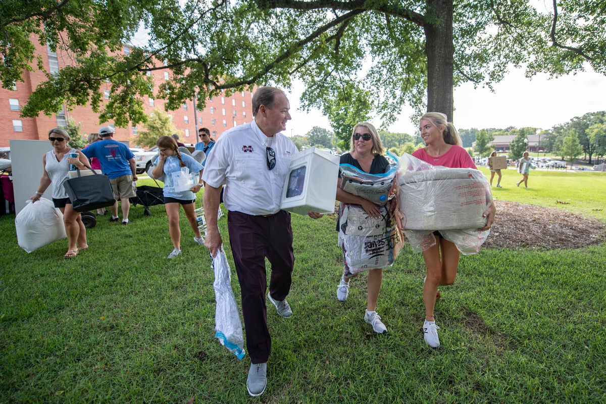 MSU President Mark E. Keenum helps Erin and Rae Elizabeth Parsons of Arlington, Virginia, as Rae moves into Oak Hall on Aug. 11. The new freshman is majoring in communication with an emphasis in public relations. Keenum gave a helping hand to several families as he welcomed students to campus.