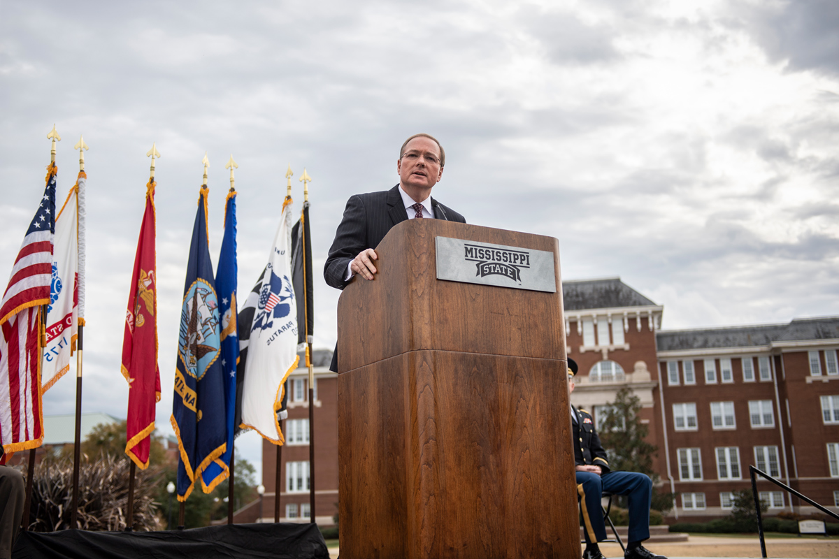 MSU President Mark E. Keenum speaks during the university’s annual Veterans Day program on the Drill Field in November. Keenum thanked military veterans for their service and the sacrifices they have made on behalf of their country. Building on historical military roots, MSU has long been recognized as one of the nation’s most veteran-friendly universities.