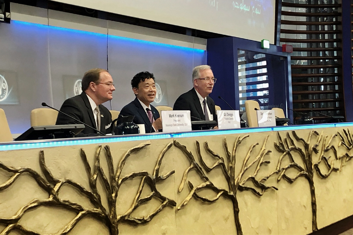 MSU President Mark E. Keenum, Food and Agriculture Organization Director-General Qu Dongyu, and FAO Deputy Director-General for Programmes Daniel Gustafson are pictured during meetings at the United Nations FAO headquarters in Rome on Wednesday [Nov. 6]. Keenum delivered a speech about the university’s work to address key challenges of the 21st century and also signed memorandums of understanding to create three new programs offering international internship, fellowship and volunteer opportunities for MSU students, recent graduates and faculty with FAO.