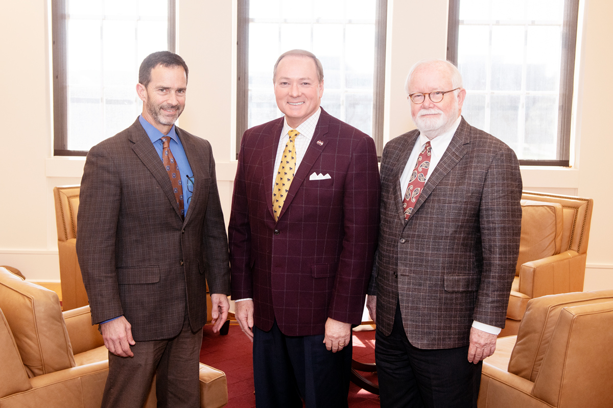 Mark E. Keenum, president of Mississippi State University, met on January 25 with Dr. Larry Sparkman, director of the Luckyday Foundation Citizenship Scholars Program at the University of Southern Mississippi, and Holmes Adams, Luckyday Foundation chairman and attorney for Adams and Reese LLC in Jackson. The three met at MSU to discuss the foundation’s work as a student development program that facilitates campus living-learning communities, service learning, and servant leadership.