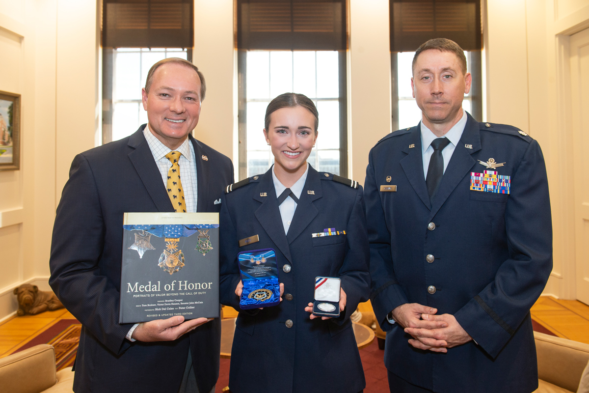 MSU President Mark E. Keenum, left, formally presented MSU Air Force ROTC Cadet Shelby Patti of Hammond, Louisiana, with the Armed Forces Communications and Electronics Association ROTC Medal of Honor Scholarship on March 27. Also pictured is USAF Lt. Col. Joseph J. Cassidy II, right. Patti, a junior chemistry major at MSU, is one of only three recipients in the U.S. receiving this honor, which is given annually by the Congressional Medal of Honor Foundation, in partnership with the AFCEA Educational Foundation. The $5,000 Medal of Honor scholarship recognizes outstanding ROTC students committed to serving in the U.S. Army, Air Force, Navy or Marine Corps.
