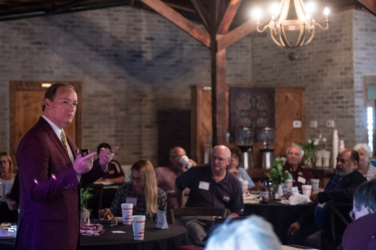 MSU President Mark E. Keenum speaks to the MSU Alumni Association’s Oktibbeha County Alumni Chapter during a “Minutes with Mark” social at The Fellowship Place at Little Dooey in Starkville. Keenum, who has served as MSU's chief executive for more than a decade, discussed recent accomplishments and projects underway at the state's leading university.