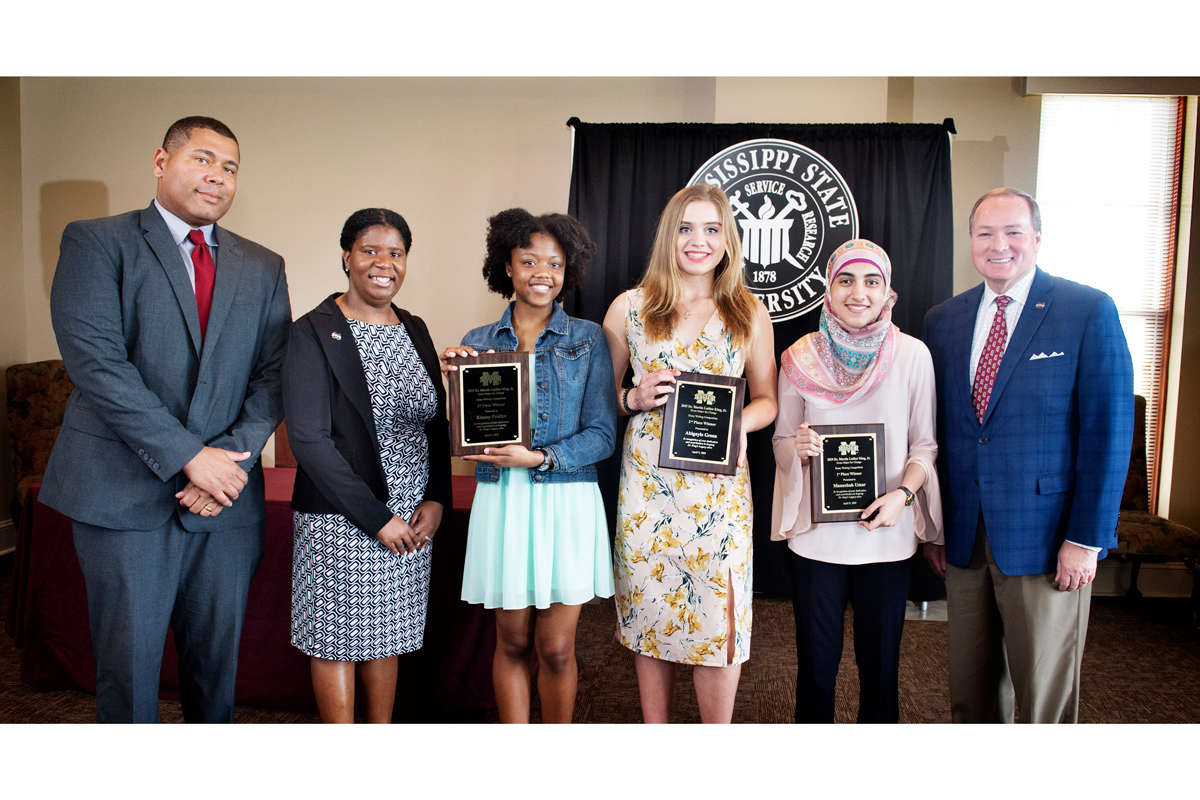 MSU President Mark E. Keenum, far right, congratulates and presents awards to three Starkville High School students for outstanding entries in Mississippi State’s Martin Luther King Jr. Essay Writing Contest. Pictured with Keenum at a recent ceremony are (left to right) Don Shaffer, associate professor of English, African American Studies program interim director and Presidential Endowed Scholarship program mentor; Ra’Sheda Forbes, assistant vice president for multicultural affairs and director of the Holmes Cultural Diversity Center; Kinsey Profice, SHS senior, third place; Abigayle Green, SHS junior, second place; and Muneebah Umar, SHS sophomore, first place.
