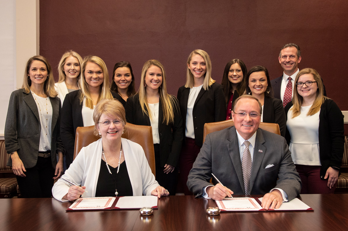 Mississippi State University Provost and Executive Vice President Judy Bonner and President Mark E. Keenum, seated left and right, marked National Nutrition Month with the signing of a proclamation Monday [March 4] announcing the annual campus observance. MSU Student Dietetic Association members coordinate the local observance and were on hand for the signing. The student organization, which promotes healthy lifestyles at MSU and in the surrounding community, is part of the Department of Food Science, Nutrition and Health Promotion in the university’s College of Agriculture and Life Sciences.