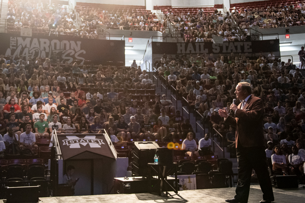 MSU President Mark E. Keenum speaks to new freshmen and transfer students taking part in New Maroon Camp at Humphrey Coliseum. Keenum welcomed the students to the Bulldog family and helped kick off the annual event that focuses on helping students build relationships on campus and ease into their transition to Mississippi State.