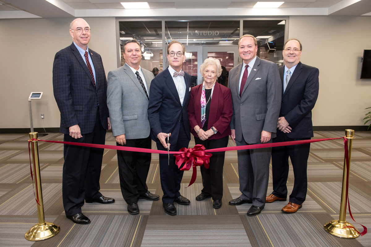 Cutting the ribbon to formally dedicate and open MSU’s MaxxSouth Digital Media Center in Mitchell Memorial Library is John Block, an owner of Block Communications Inc., of which MaxxSouth Broadband is a subsidiary. Block, who has been instrumental in supporting the center’s renovation and expansion of services, is joined by, from left, Professor of Communication John Forde; Associate Dean of Libraries Stephen Cunetto; Dean of Libraries Frances Coleman; MSU President Mark E. Keenum and Dean of the College of Arts and Sciences Rick Travis.