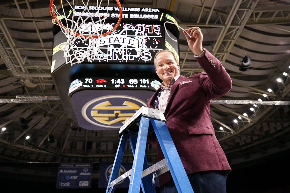 MSU President Mark E. Keenum cuts out a piece of the net after MSU won the 2019 SEC Women’s Basketball Tournament in Greenville, South Carolina on March 10. After capturing the SEC regular season championship for the second year in a row, the Bulldogs won the SEC Tournament in dominant fashion, defeating Arkansas 101-70 in the tournament final.